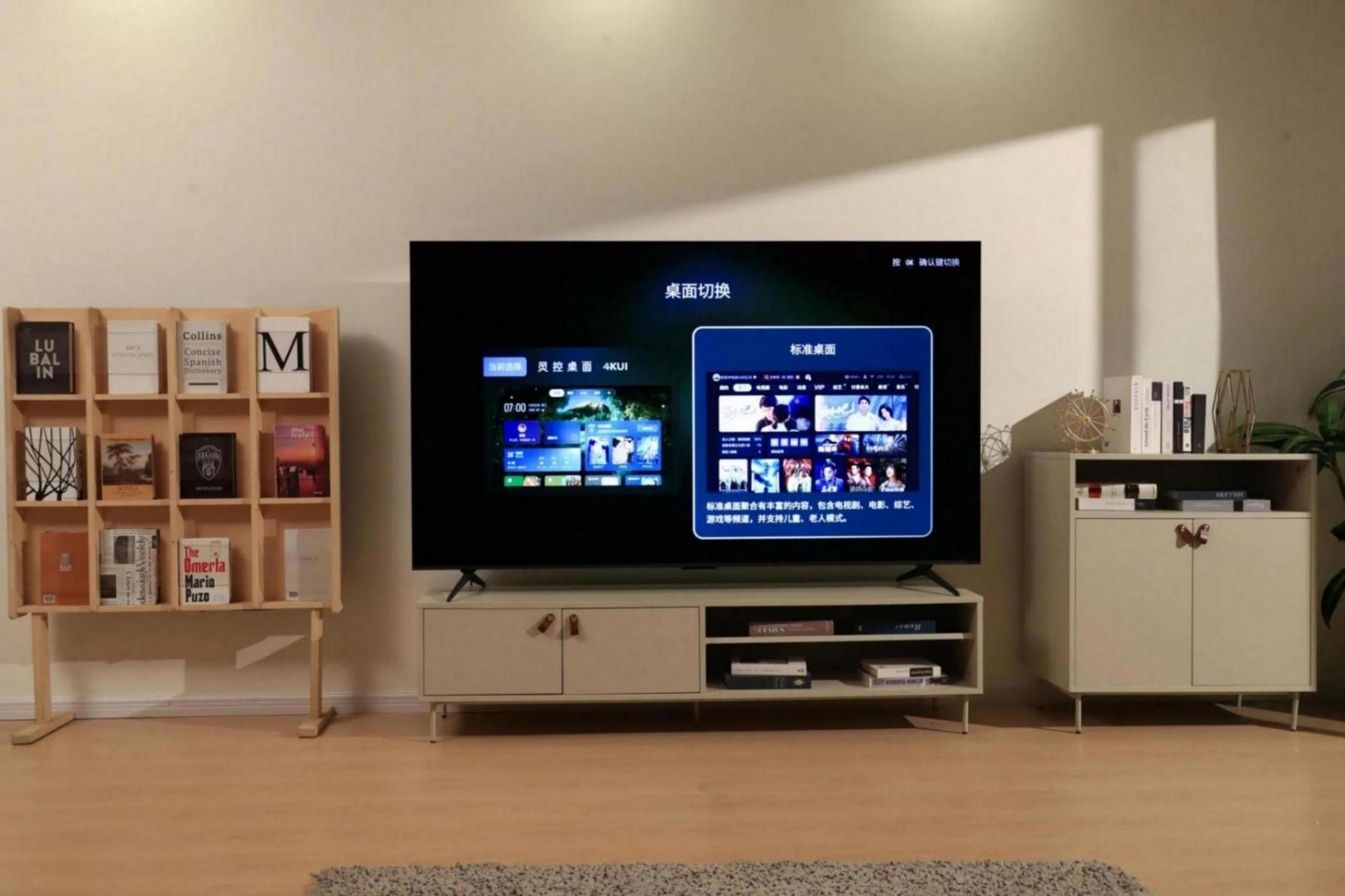 開機后,靈控系統 3.0 界面簡潔流暢,4K 壁紙和 4KUI 畫質清晰細膩,色彩鮮艷逼真。操作方便,可自由設置桌面布局,創建文件口袋分類管理應用。家里人多也不怕,分身系統能為每個人打造專屬快捷電視桌面,滿足不同使用習慣,老人小孩也能輕松上手。