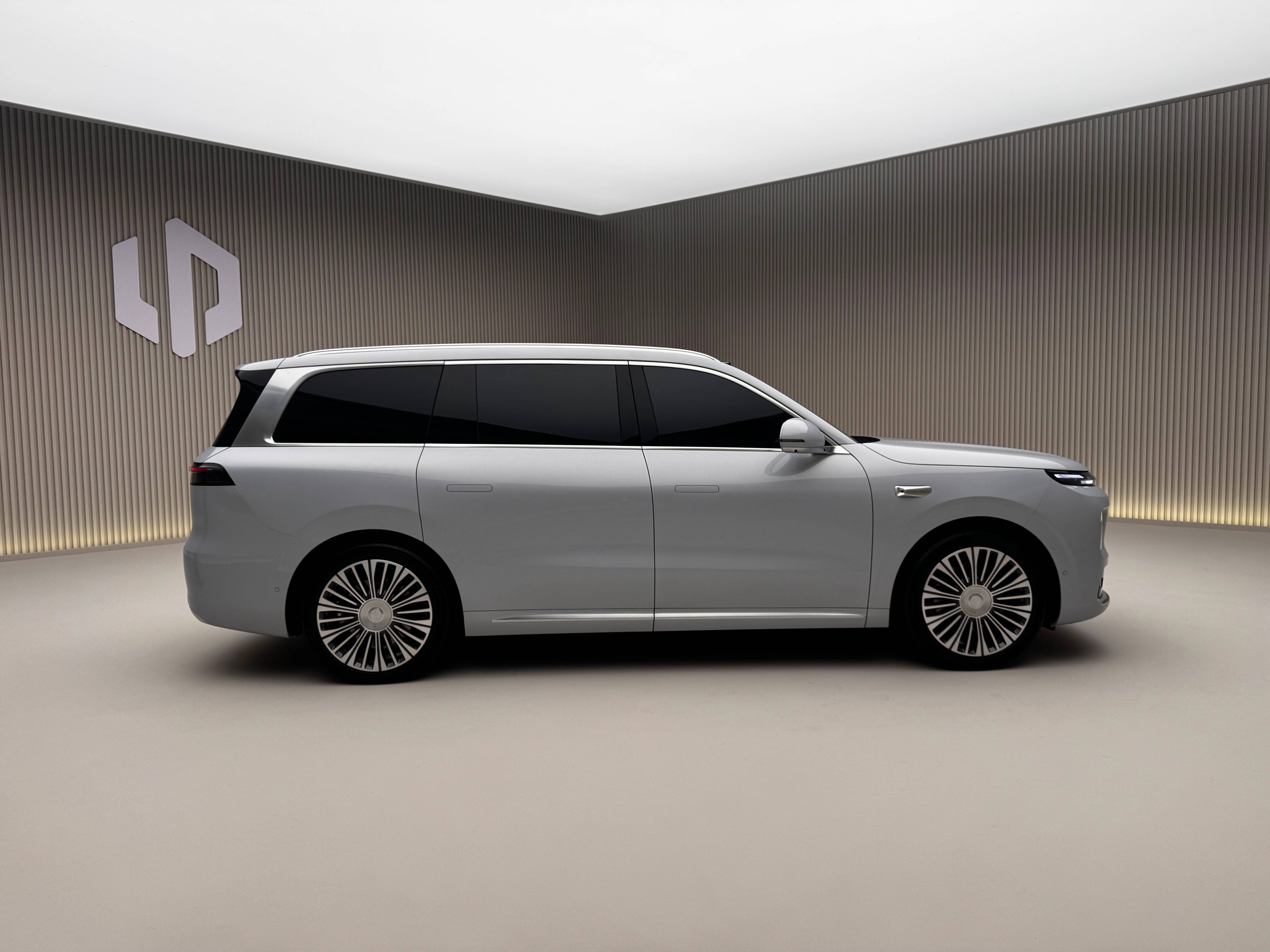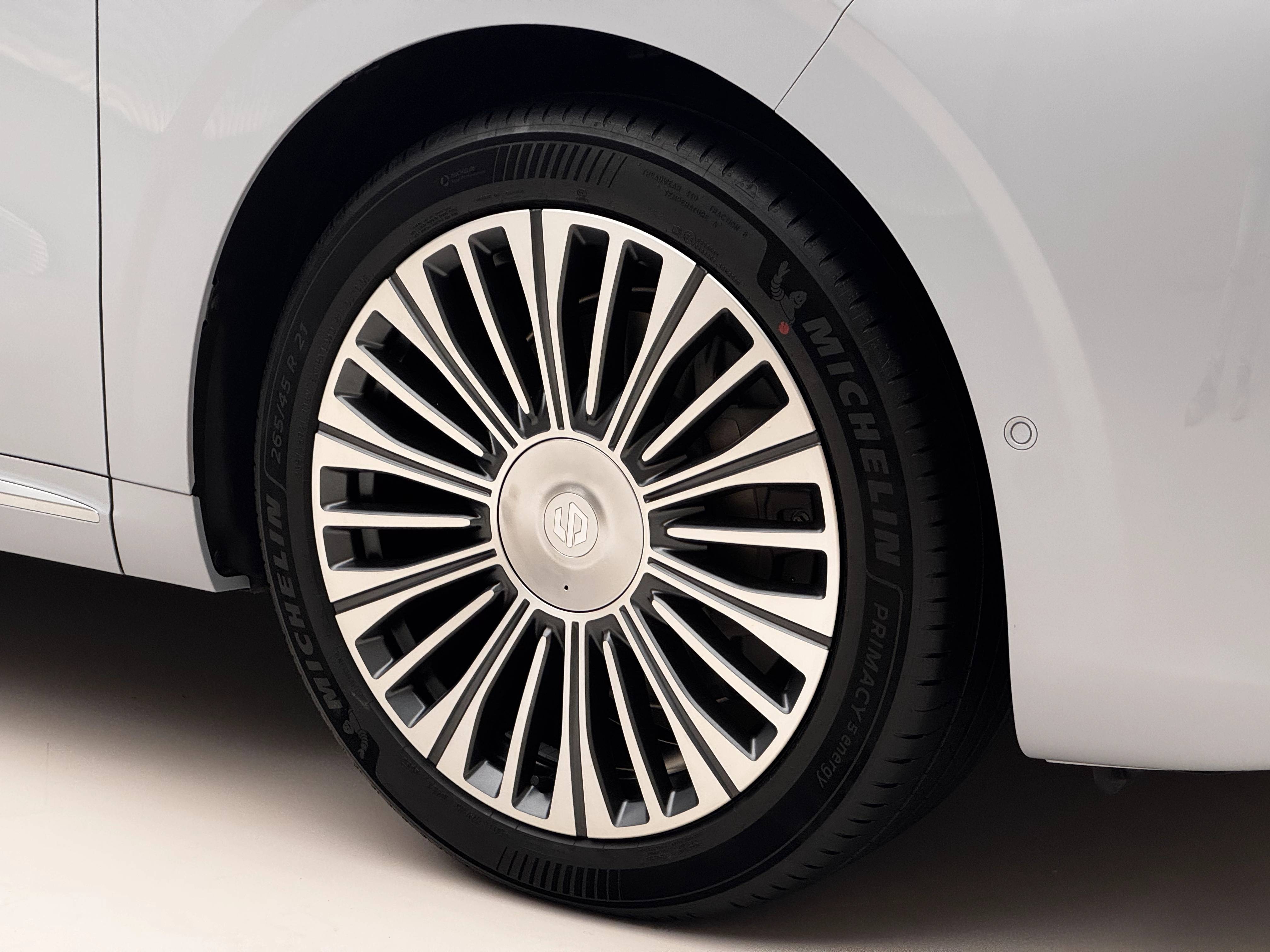 零跑D19沒有轎跑化的線條,側身就是標準SUV方正的款式,給第三排保留寬裕的頭部空間。值得提及的是側窗,雖然沒有隱藏水切,但三排車窗做到純平,對審美和降噪都有好處。此外,零跑還在D柱用了大面積的鍍鉻飾板,與極氪旗艦SUV心有靈犀。D19搭載21英寸米其林浩悅5輪胎,配合鏡面輪輞的氣質很亮眼。