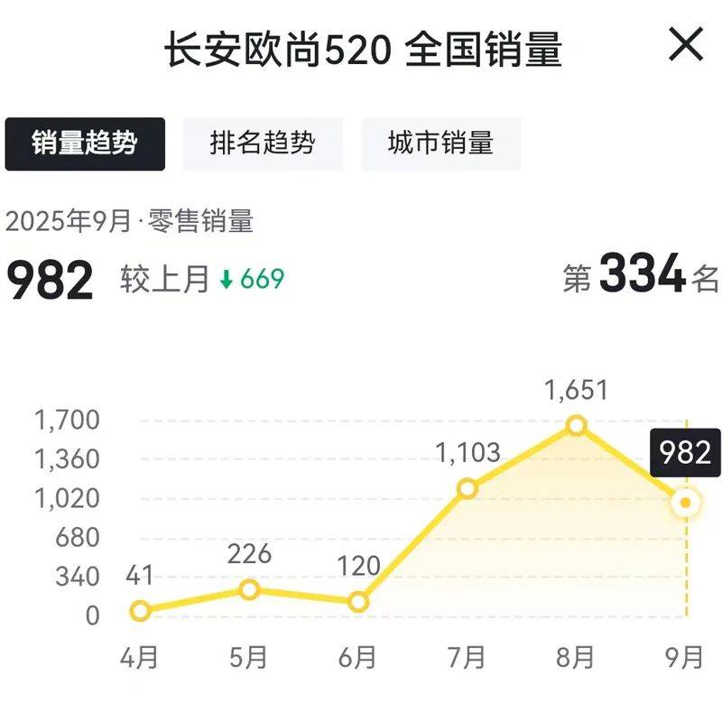 此外,長(zhǎng)安歐尚的另外一款車型,長(zhǎng)安歐尚520在9月份的銷量為982輛,相比今年8月份的銷量1651輛,環(huán)比下滑40.52%。