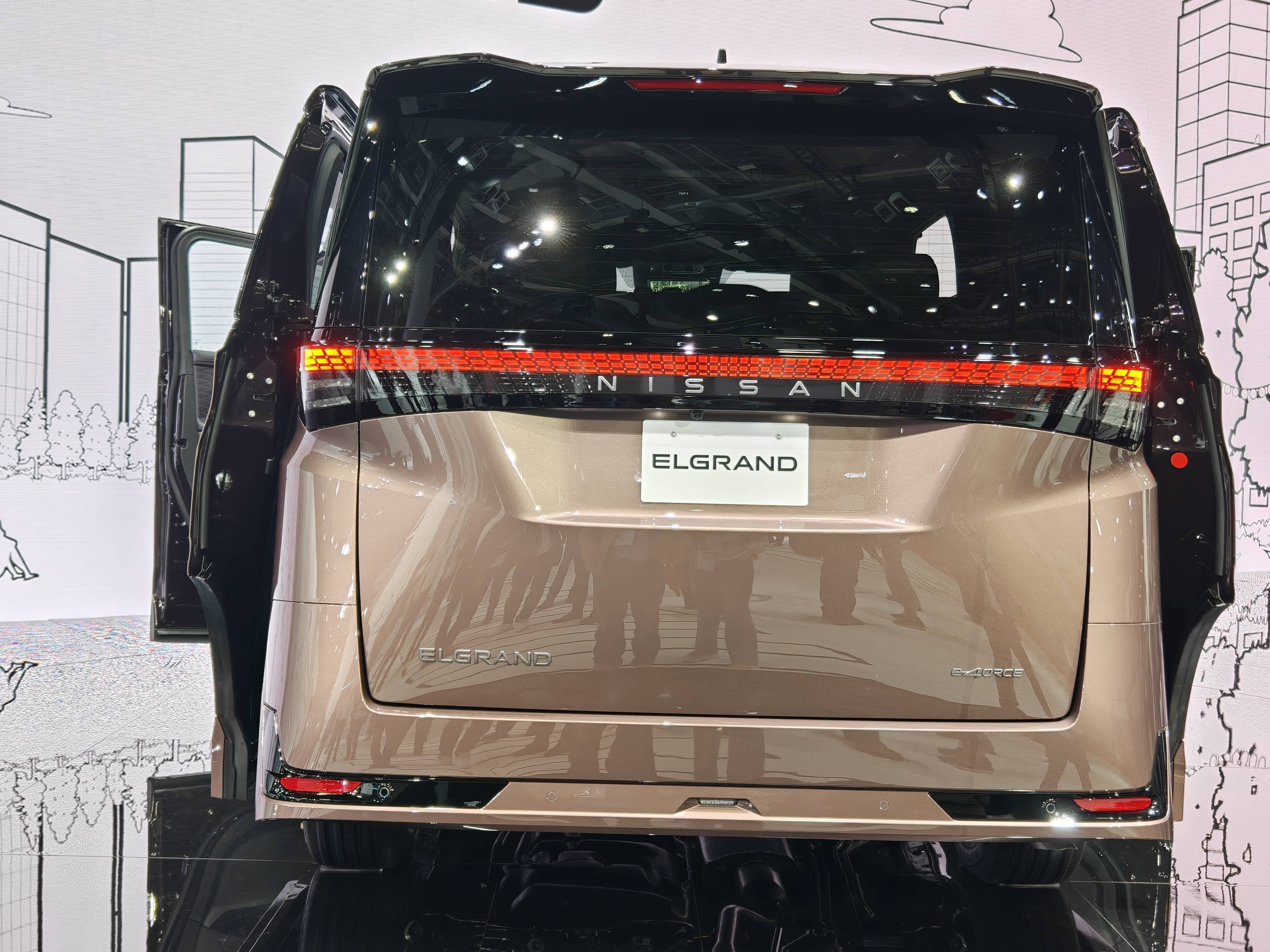 全新ELGRAND的側面非常平整,腰線向上的設計讓這個大塊頭有了更多動勢。而輪轂雖然依然是18英寸,但是扁平化的設計和厚實的輪胎看上去并不“小腳”。而車尾設計看上去像是一個箭頭的形狀,有點反視覺。仔細看會發(fā)現(xiàn)可以發(fā)現(xiàn)ELGRAND其實是在D柱上做了一個向后擾流板的設計,結合斜切的尾燈,這樣車尾就形成了一個箭頭向前的視覺感。
