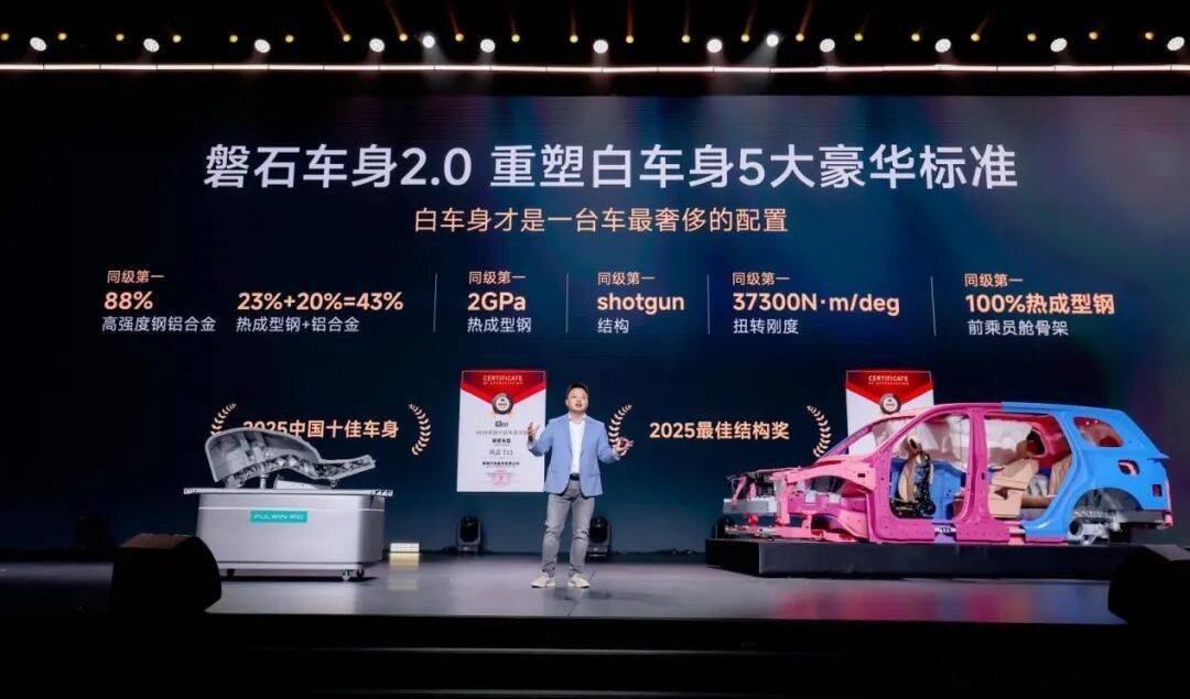 在安全領(lǐng)域,風(fēng)云T11的“磐石車身2.0”堪稱行業(yè)標(biāo)桿。李學(xué)用現(xiàn)場(chǎng)拆解了其安全設(shè)計(jì)的核心:88%高強(qiáng)度鋼鋁占比、2GPa熱成型鋼(相當(dāng)于潛艇級(jí)鋼材強(qiáng)度)、37300N·m/deg扭轉(zhuǎn)剛度,這三組數(shù)據(jù)不僅是同級(jí)第一,更遠(yuǎn)超不少百萬(wàn)級(jí)豪車的標(biāo)準(zhǔn)。