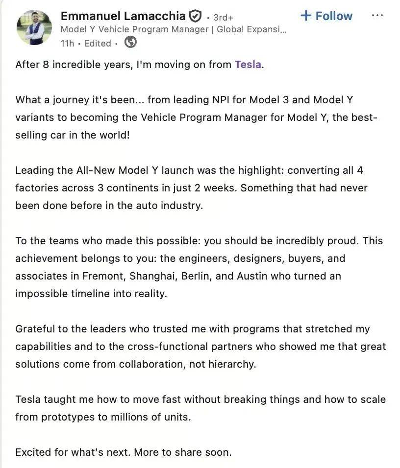 在阿瓦斯蒂宣布離開公司的幾小時后,暢銷車型Model Y的項目經理伊曼紐爾·拉馬奇亞Emmanuel Lamacchia也對外正式宣布離開特斯拉。