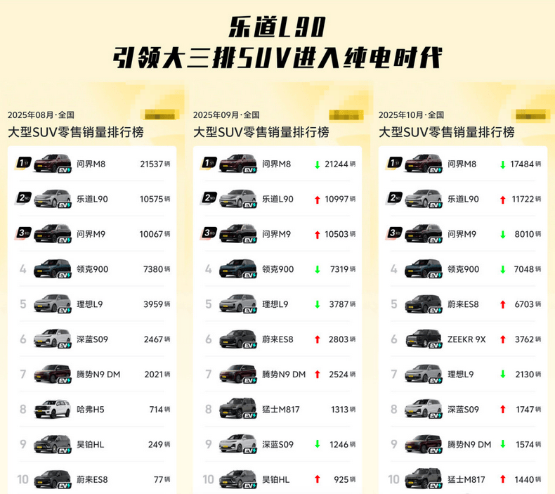 這哪是銷量爬坡?分明是踩著風(fēng)火輪沖刺純電大型SUV的銷冠寶座!更關(guān)鍵的是,這兩款車已連續(xù)三個月蟬聯(lián)細(xì)分市場第一,硬生生把“高端純電賣不好”的黑子們一頓打臉。
