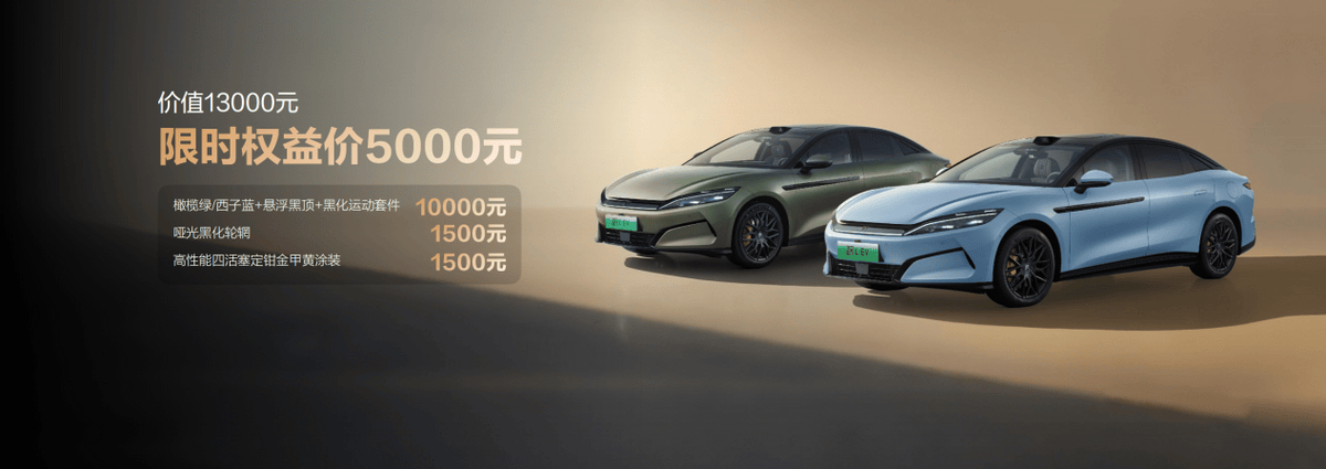 在產品之外,比亞迪特別推出豐厚外觀限時選裝權益。漢L原價13000元的外觀套裝(含橄欖綠/西子藍車色、懸浮黑頂、黑化運動套件、啞光黑化輪輞、性能四活塞定鉗金甲黃涂裝),限時權益價僅需5000元!購車還可享高達15000元的超級置換禮。(以上權益截至12月31日)