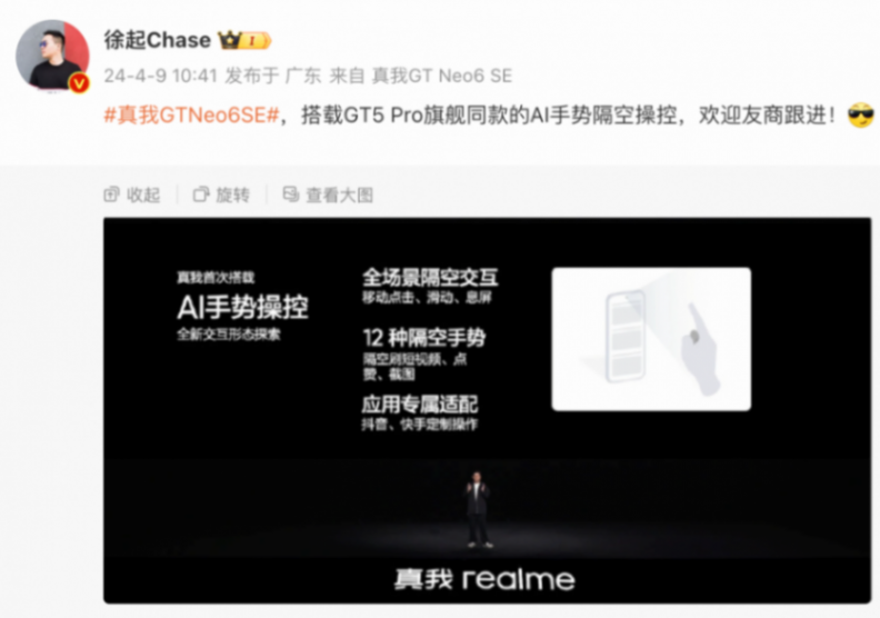 不過(guò)說(shuō)到AI隔空手勢(shì),真我這邊就有話說(shuō)了,realme中國(guó)區(qū)總裁徐起表示真我GT5 Pro就配備有AI手勢(shì)隔空操控,這次真我GT Neo6 SE也將搭載旗艦同款功能,歡迎友商跟進(jìn)。你的手機(jī)有AI隔空手勢(shì)嗎?