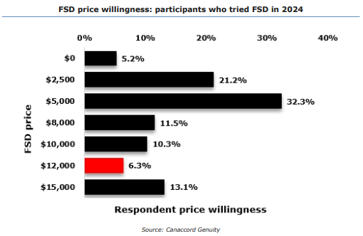 數(shù)據(jù)還顯示,超過(guò)一半的受訪者的心理價(jià)位在2500美元和5000美元兩個(gè)檔次,不及FSD當(dāng)前定價(jià)的一半。