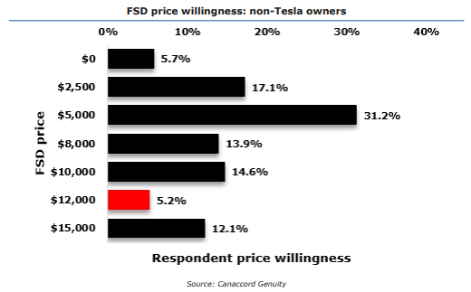由加拿大投行加通貝祥(Canaccord Genuity)發(fā)起的“您愿意為特斯拉的FSD支付多少錢(qián)?”最新調(diào)查顯示,有82.7%的受訪者只愿支付1萬(wàn)美元及以下的價(jià)格,僅有5.6%的受訪者表示愿意支付1.2萬(wàn)美元購(gòu)入整套FSD。