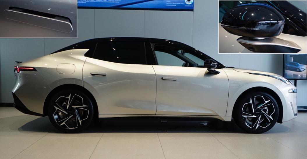 側(cè)面造型同樣頗有看點(diǎn),車身比例協(xié)調(diào),軸距適中,前懸較短、后懸較長(zhǎng),高度較低。黑色車頂在C柱前平直、C柱后快速下滑,形成很有特色的溜背感。車身腰線在后門(mén)把手處快速上揚(yáng),與回鉤造型的C柱融合,并有顯著的向內(nèi)向后收縮的趨勢(shì),優(yōu)化空氣動(dòng)力學(xué)效果。四個(gè)車門(mén)都是無(wú)框門(mén),后窗采用很深的隱私玻璃。采用與領(lǐng)克08相同的Flush Door車窗,玻璃與立柱位于同一平面,讓側(cè)面十分整潔,不僅顯高級(jí)還能降低風(fēng)噪。外后視鏡底座造型很有設(shè)計(jì)感,集成側(cè)攝像頭,全黑色外殼集成側(cè)轉(zhuǎn)燈,提供與領(lǐng)克08相同的滿框式后視鏡玻璃,有高級(jí)感。門(mén)把手為整體隱藏彈出式,駕駛位帶無(wú)鑰匙進(jìn)入。