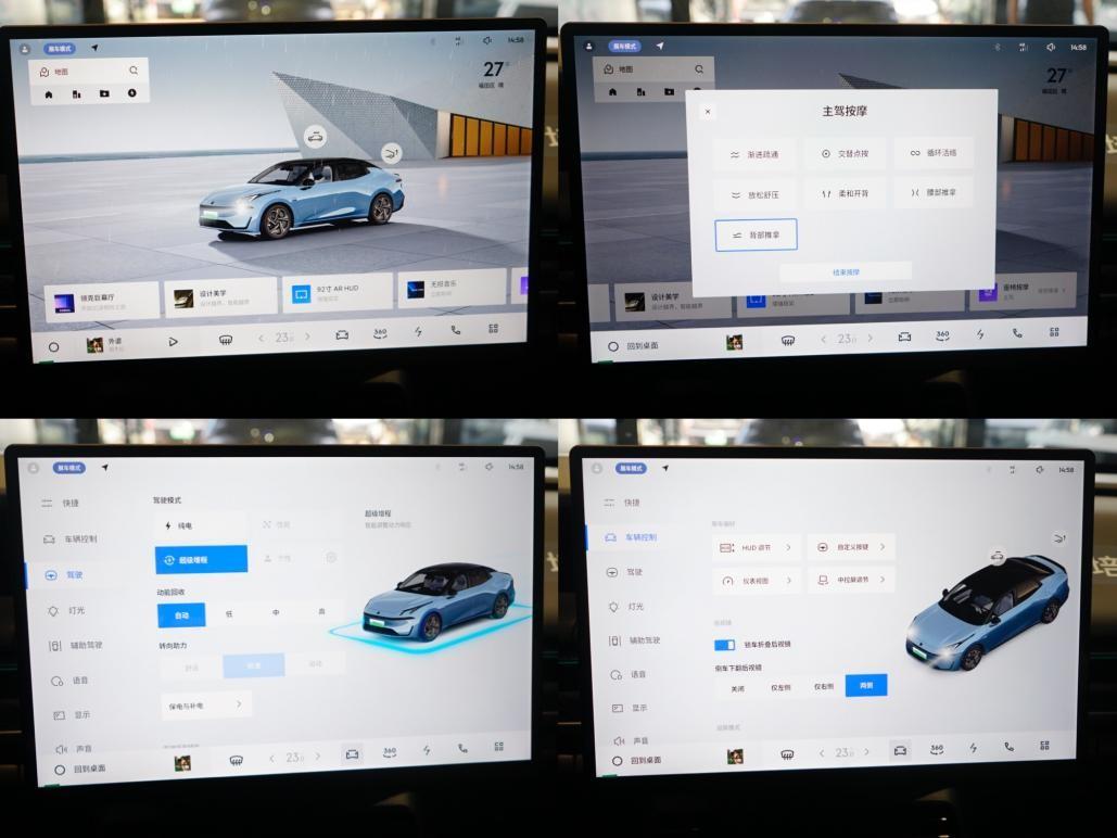 15.4英寸外掛式中控屏邊框較窄,分辨率達(dá)到2.5K,F(xiàn)lyme Auto車機(jī)集成化程度很高,所有硬件都可以通過(guò)屏幕控制,包括方向盤(pán)、外后視鏡、天窗、尾門(mén)等,實(shí)現(xiàn)可見(jiàn)即可說(shuō)。提供三種桌面,還可自定義,應(yīng)用中心可下載軟件。桌面支持Smart bar功能,任意一功能卡片可放大縮小與拖動(dòng),與手機(jī)體驗(yàn)接近。比較有特色是巨幕廳功能,把23個(gè)喇叭的哈曼卡頓音響系統(tǒng)、氛圍燈、座椅按摩功能聯(lián)動(dòng)起來(lái),觀看影片時(shí)氛圍燈會(huì)呼吸式變化、座椅有震動(dòng)感、空調(diào)會(huì)根據(jù)劇情出風(fēng),音響有環(huán)繞效果,體驗(yàn)很超前。車機(jī)與手機(jī)也能實(shí)現(xiàn)無(wú)縫切換和信息轉(zhuǎn)換,十分便利。