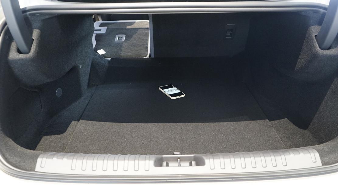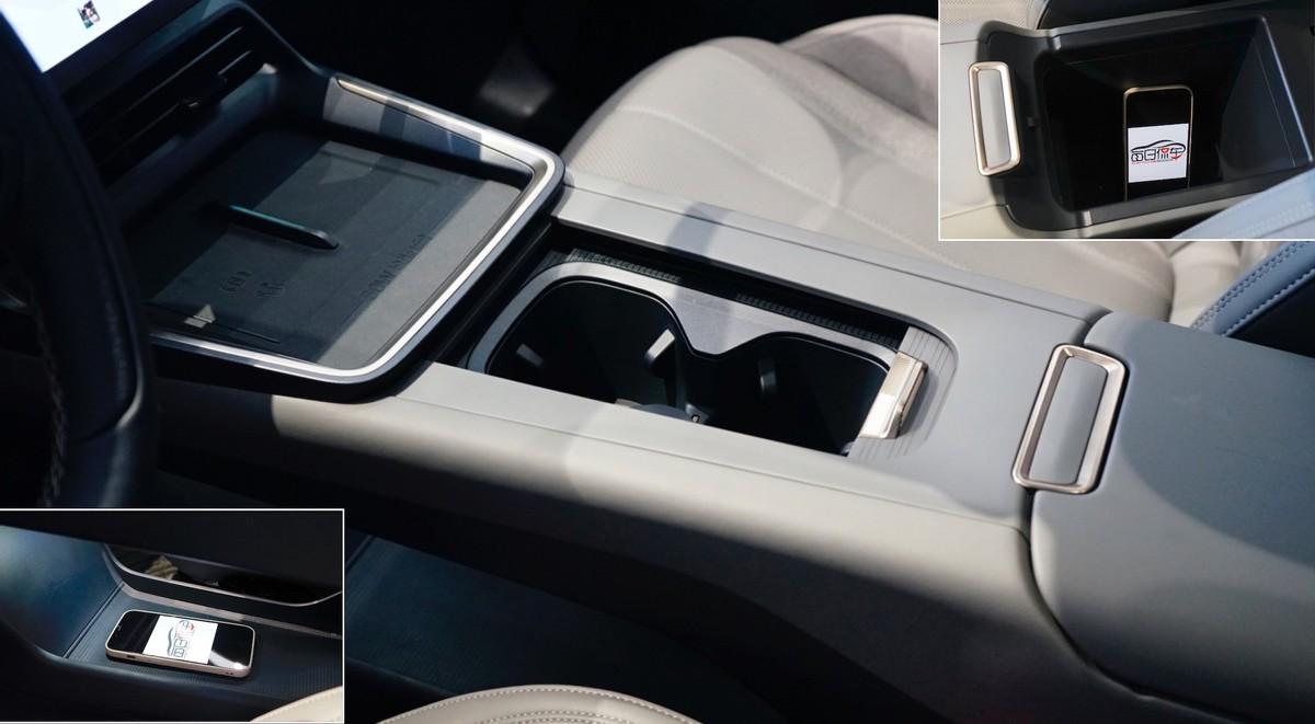 扶手臺(tái)成為純粹的儲(chǔ)物空間,前方雙手機(jī)格左側(cè)帶50W無(wú)線快充,麂皮材質(zhì)有防滑效果。滑蓋下方是雙杯架,后方扶手箱的容積不算大,但下方懸浮空間高度與長(zhǎng)度都比較可觀,能放置不少物品。