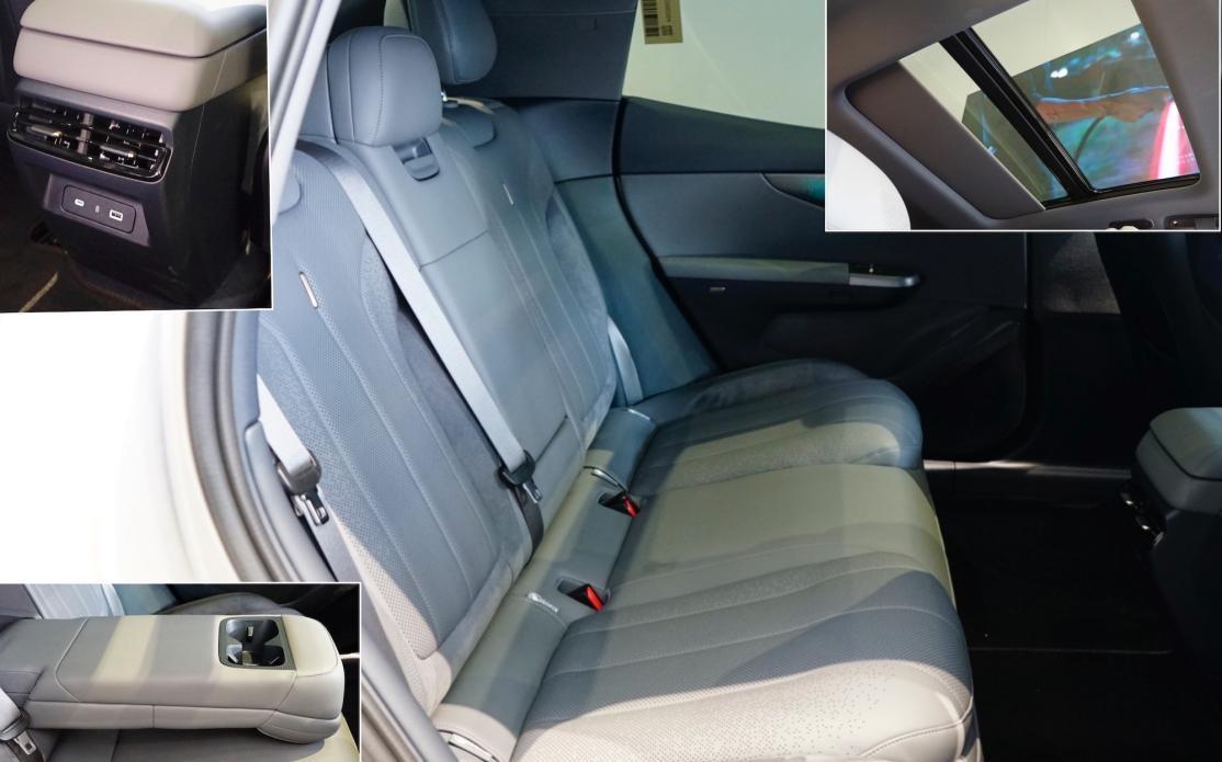 后排座椅長(zhǎng)度一般,但采用夸張的加厚處理,保證腿部承托性足夠。靠背傾斜角度合適,有一定的側(cè)向支撐,整體舒適感不錯(cuò)。空間方面,侃弟身高175cm,腿部接近3拳,頭頂有一拳,橫向乘坐三人輕松,地板為全平。配置上,車頂全景天窗面積不算大,帶電動(dòng)遮陽(yáng)簾;地臺(tái)出風(fēng)口帶雙USB接口;中央扶手尺寸很大,靠起來(lái)很舒適,并帶雙杯架。