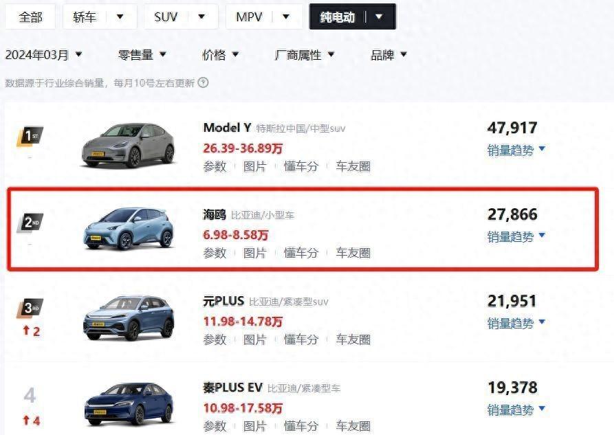 當(dāng)談及純電動(dòng)汽車市場(chǎng),比亞迪海鷗憑借其卓越的性能、豐富的配置和實(shí)用的空間,在競(jìng)爭(zhēng)激烈的市場(chǎng)中脫穎而出。與此同時(shí),翻開2024年3月份純電動(dòng)車市場(chǎng)銷量榜單,比亞迪海鷗以6.98萬(wàn)元起售的價(jià)格,以小型代步車的身份,穩(wěn)居純電動(dòng)車銷量榜的第二名,將競(jìng)爭(zhēng)格局推向新的高度。那么,在這個(gè)價(jià)位,海鷗是否有對(duì)手呢?