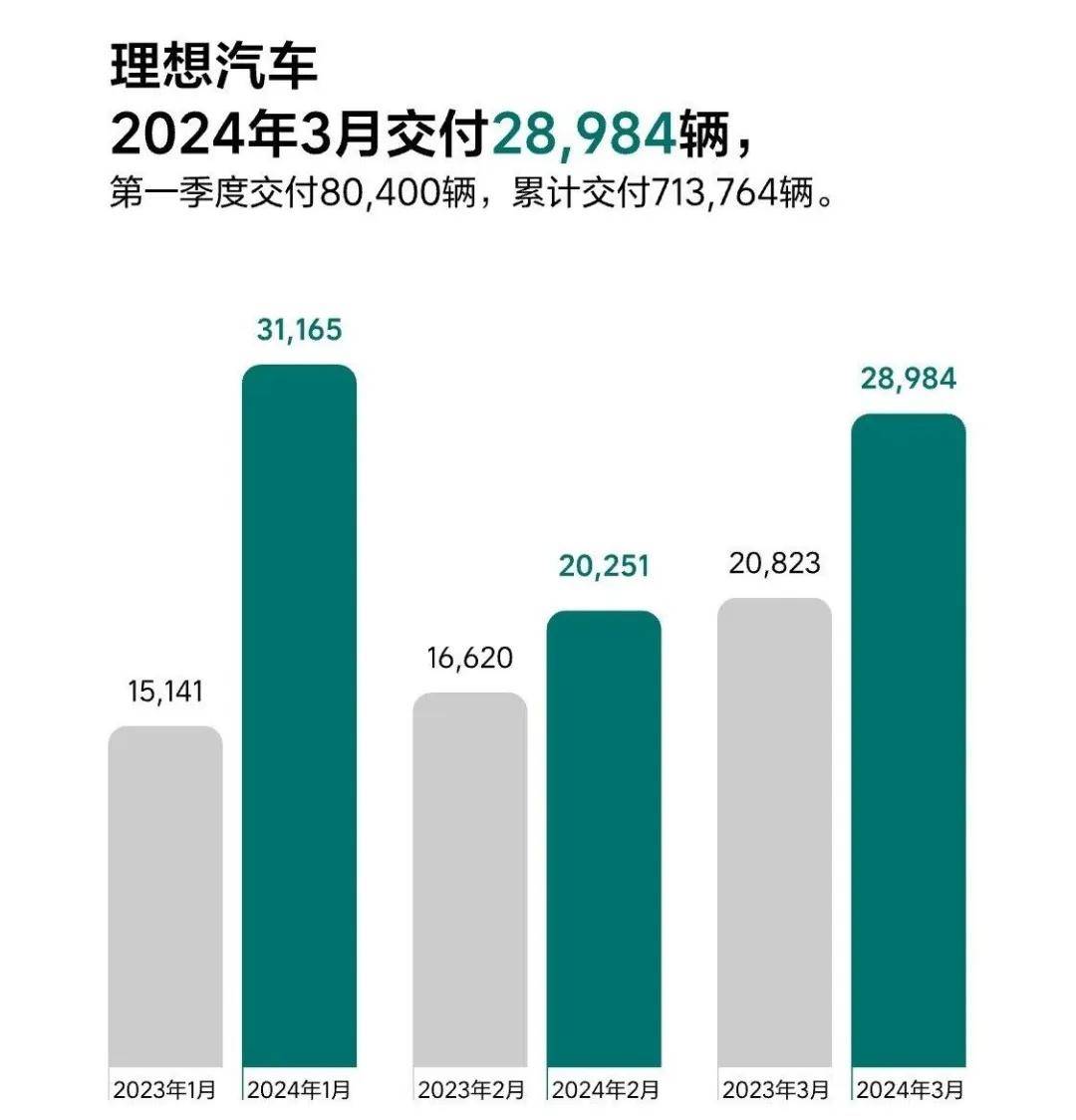 庫存和銷量是息息相關(guān)的兩個要素,從2024年的數(shù)據(jù)來看,理想汽車的銷量開始遇到了瓶頸。最近公布的3月份銷量數(shù)據(jù),理想汽車3月份總共交付了28984輛;第一季度理想汽車累計交付80400輛,看似不錯的成績背后隱藏著“增長乏力”的暗傷。