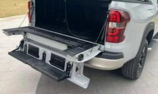 新車貨廂尾門設計也很有意思,除了正常的開啟方式,還可以形成臺階,可以坐在上面釣魚,也方面女性用戶攀爬,總之實用性做得很好。