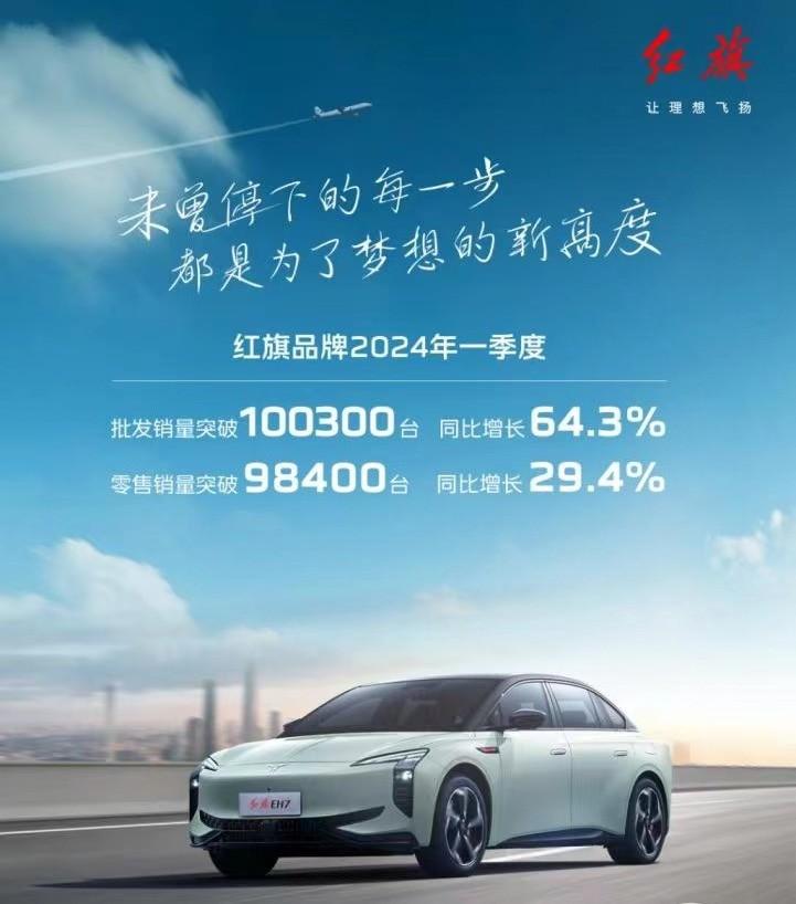 2023年,紅旗品牌取得了超37萬臺的年銷量成績,在市場競爭激烈且內卷的大環境下,創下了連續6年正增長的成績。今年一季度,紅旗批發、零售再創佳績,其中零售銷量突破98,400輛,同比增長29.4%。