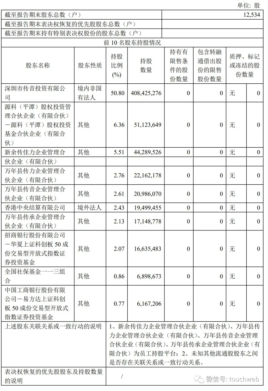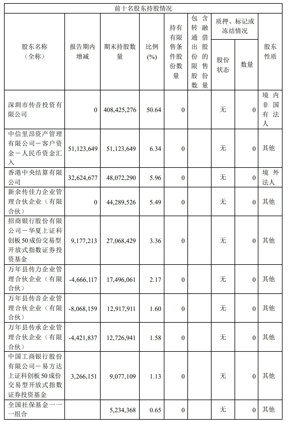 萬年縣傳力企業(yè)管理合伙企業(yè)(有限合伙)持股為2.17%,萬年縣傳音企業(yè)管理合伙企業(yè)(有限合伙)持股為1.6%,香港中央結算有限公司持股為2.43%,萬年縣傳承企業(yè)管理合伙企業(yè)(有限合伙)持股為1.58%,中國工商銀行股份有限公司-易方達上證科創(chuàng)板 50 成份交易型開放式指數(shù)證券投資基金持股為1.13%,全國社保基金一一一組合持股為0.65%。