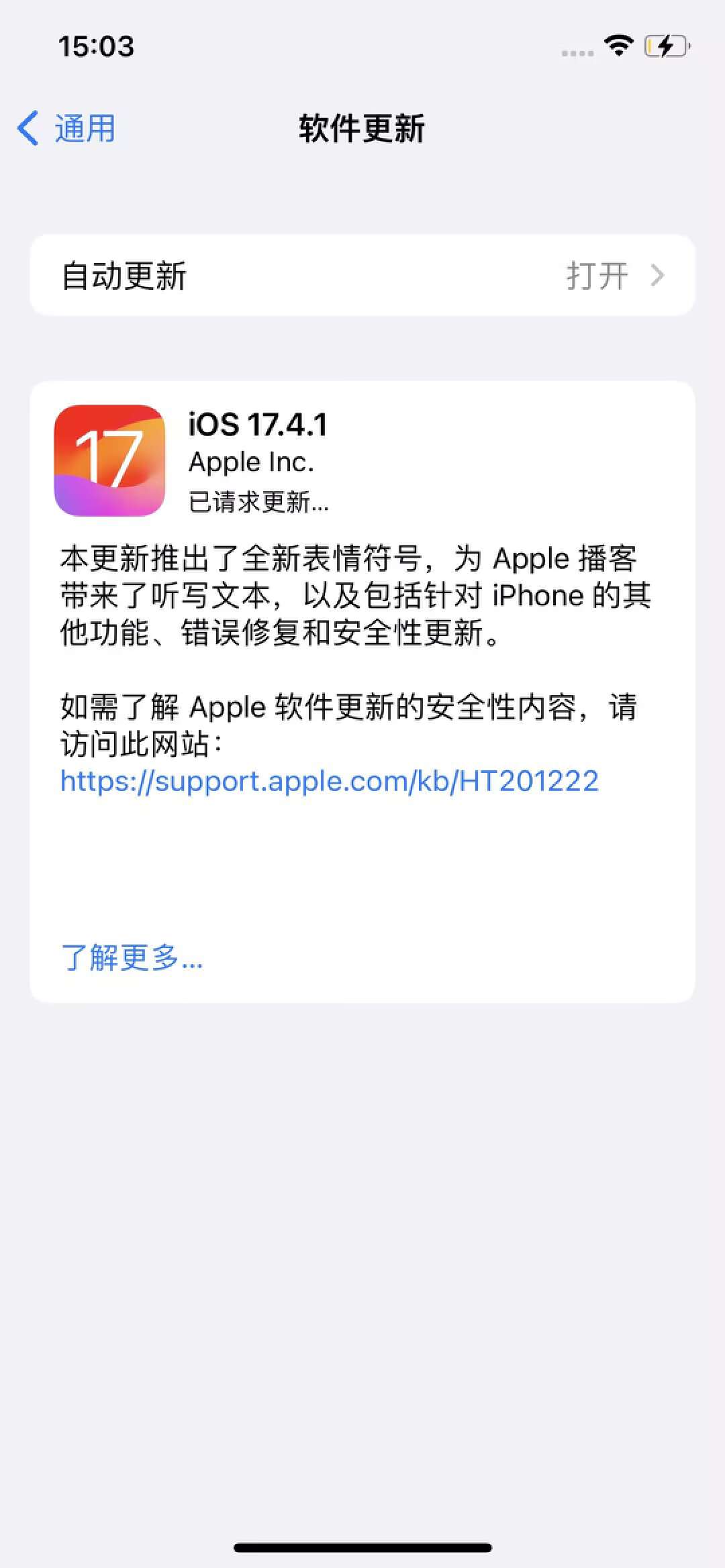 手機收到iOS17.4.1的更新推送,公告中提到“針對iPhone的其他功能更新”中,包括iPhone12對于Qi2無線充電的支持。