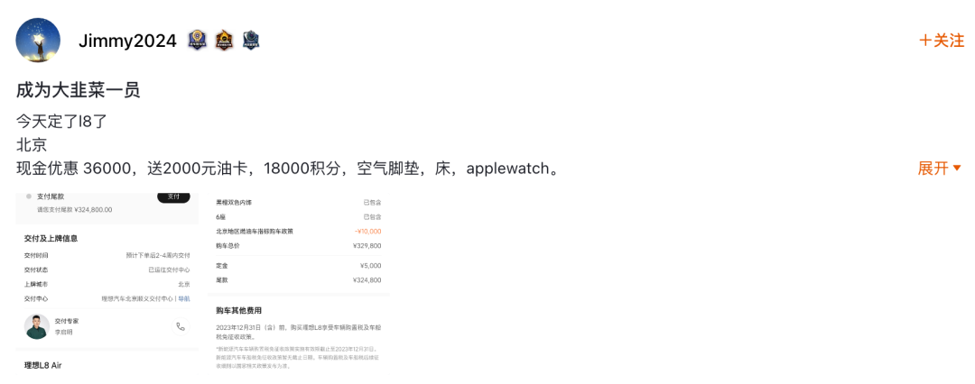 總的來說,目前2023款理想L系在春節前推出優惠活動,一方面是清庫存行為,2024款L系將會在3月發布并交付,此舉能夠避免消費者存在信息差,購買2023款車型后存在不滿行為。另一方面則是市場銷售壓力,理想汽車在2024年第一周銷量被AITO問界反超,L系車型銷量下滑明顯,降價優惠則能夠讓市場重新關注理想汽車。遺憾的是,理想汽車并未公布具體優惠金額,不同版本車型有不同的優惠幅度,各城市地區之間的優惠幅度也大有不同。