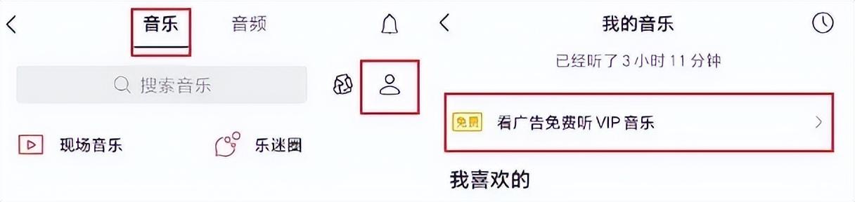 點擊“音樂”首頁,右上角的人形圖標(biāo),即可在“我的音樂”頁面,看到置頂?shù)?strong>“看廣告免費聽VIP音樂”。