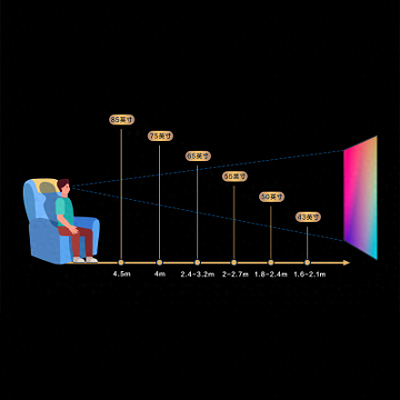 首先要選擇合適尺寸的智能電視,現(xiàn)在的智能電視尺寸從43英寸到100英寸應(yīng)有盡有,但是電視機(jī)和客廳之間,要恰如其分,不應(yīng)選擇過(guò)小或過(guò)大的尺寸,影響整體觀感。所以,選擇智能電視大小以及觀看距離,參考下圖。