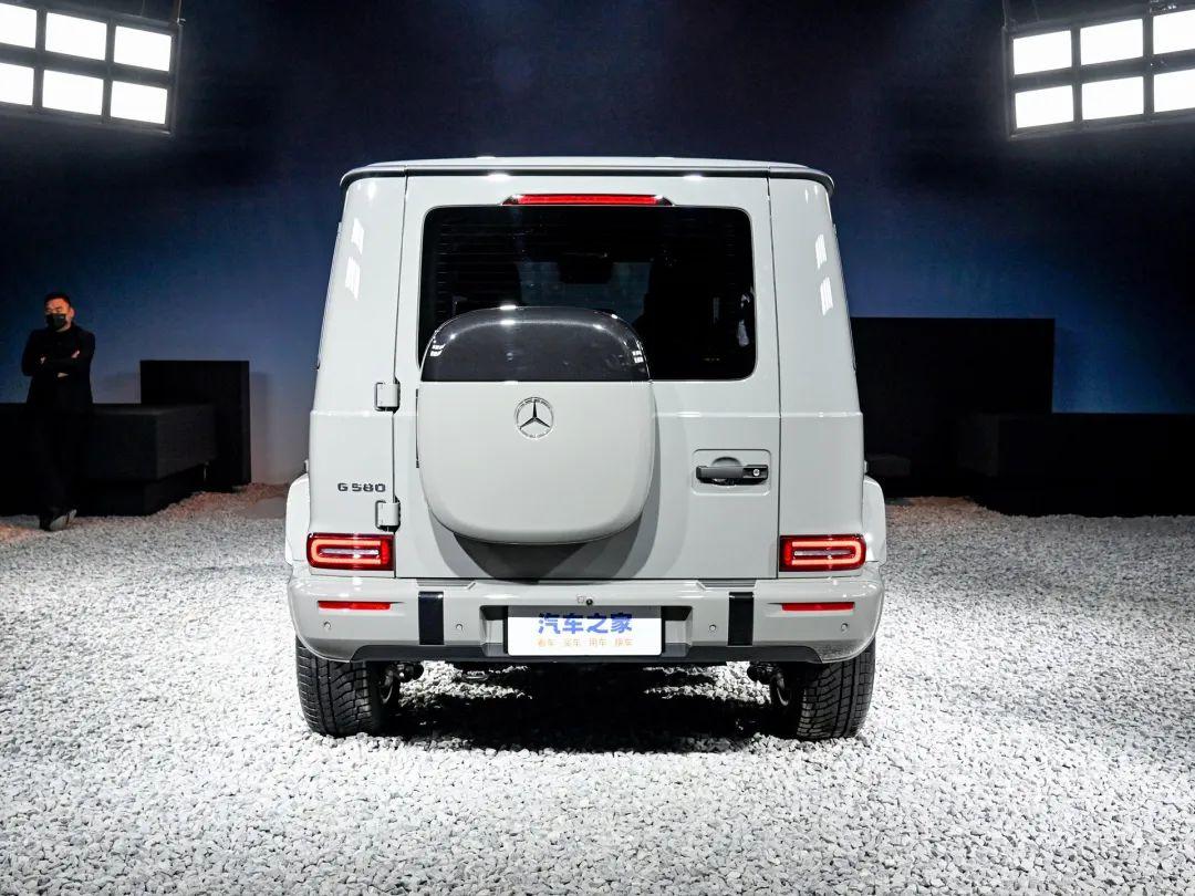 車身側面,G 580車身側面造型依舊保持了經典元素,粗壯的腰線裝飾上增加了藍色飾條的裝點,表明這是一款新能源車型。尺寸方面,G 580長寬高分別為4624/1931/1986mm,軸距為2890mm,總質量為3.5噸,配備265/50 R18的輪胎。車尾部分,G 580尾部造型與燃油版車型高度一致,車輛尾門上的小書包變成了儲物格,方便存放一些小件物品,以及充電線。