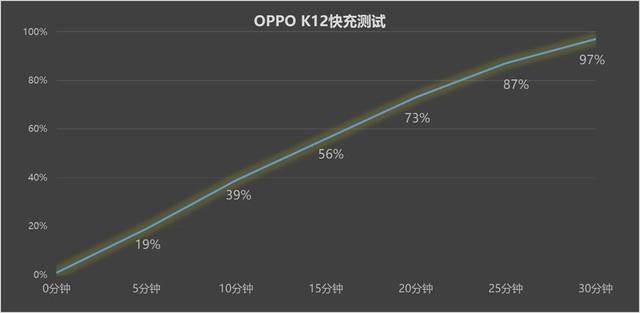 可以看到,OPPO K12僅用5分鐘就能給5500mAh大電池充入20%左右電量,15分鐘過半,30分鐘左右充滿,這個速度已經與高端旗艦所差無多,中端產品也能普及旗艦級別的充電速度。