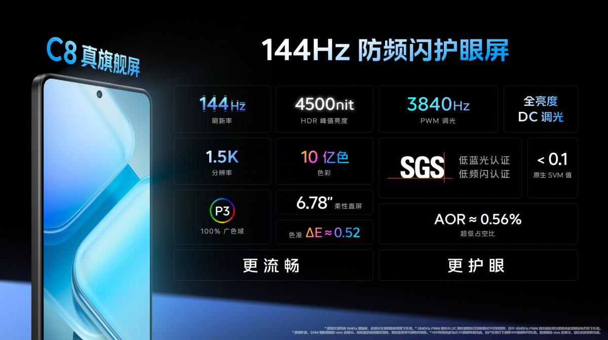 iQOO Z9 Turbo與iQOO Z9 采用了144Hz 超高刷新率的華星 C8 旗艦屏,并通過了SGS 低藍光及低頻閃雙重認證。局部峰值亮度高達4500nit,能夠適應多種環境,局部明暗細節的對比更真實更震撼。144Hz 超高刷新率以及1.5K 分辨率在視覺上更加流暢,并帶來更快的響應速度,讓用戶暢享極致影音與游戲體驗。