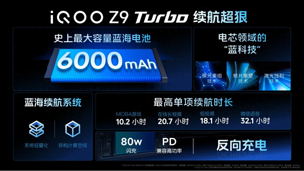 此次,iQOO Z9全系配備 6000mAh大電池。iQOO Z9 Turbo與iQOO Z9采用藍海電池技術,讓兩款手機快充、耐用和輕薄三者兼得。iQOO Z9 Turbo與iQOO Z9支持80W 閃充,7.5W 有線反向充電。