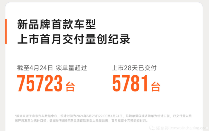 作為一臺名副其實的“破圈”車型,小米SU7的熱度并不只存在“車圈”內(nèi),潑天的流量自然也給小米帶來了非常可觀的訂單。截止至截止至4月24日,小米汽車已經(jīng)斬獲75,723張訂單,并同時交付5,781臺新車。從銷量來說,小米已經(jīng)打響了第一炮。