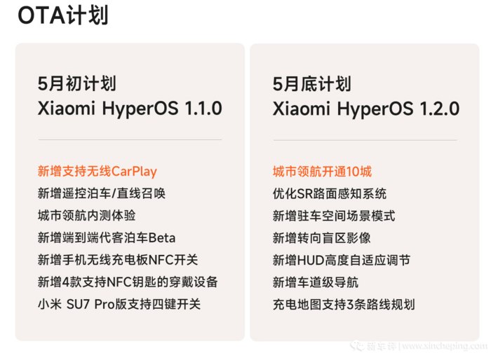 另外,小米也預告了近期的OTA更新計劃。首先是5月初將更新Xiaomi HyperOS 1.1.0系統(tǒng),將新增Carplay遙控泊車、城市領航內(nèi)測、代客泊車等功能。