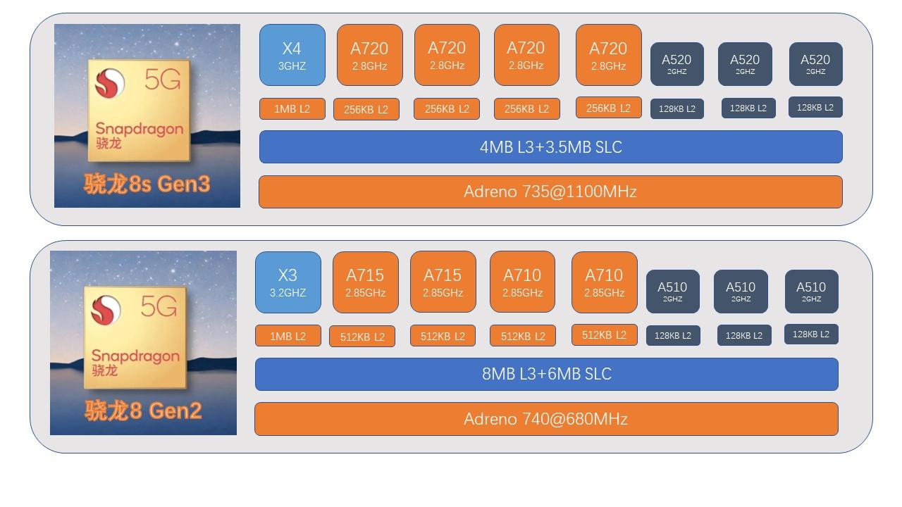 最終的結(jié)果就是,驍龍8s Gen3的性能并沒有超過驍龍8 Gen2,而且在更加重要的能效表現(xiàn)上面,驍龍8 Gen2明顯強于驍龍8s Gen3,這導(dǎo)致的結(jié)果就是驍龍8 Gen2在實際使用中不僅僅具有更好的性能釋放水平,還具有更好的溫度和能耗表現(xiàn)。