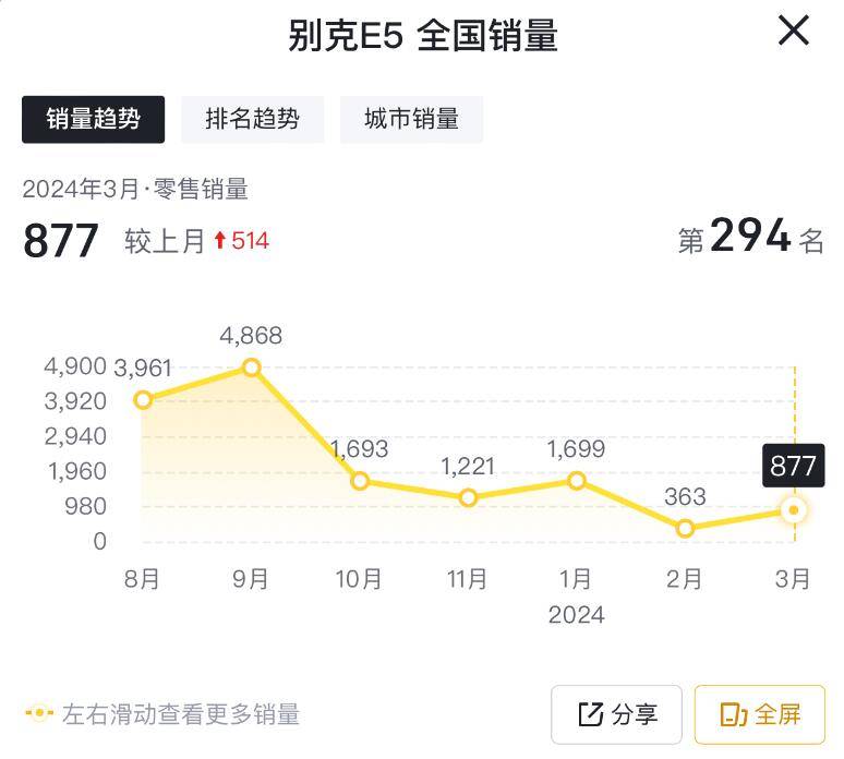 最新行業綜合銷量數據顯示,2024年3月份,別克E5的單月零售銷量為877臺。相比上個月,銷量上漲幅度,還是比較喜人的。