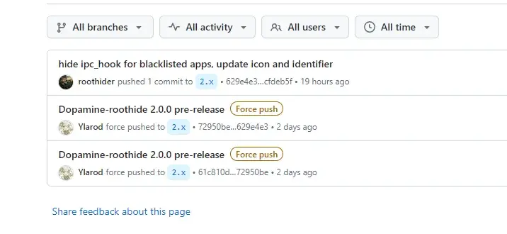 目前 Roothide 大神還未發(fā)推告知,消息來源于 Github 上公開得知,從項(xiàng)目活動(dòng)可見,大神將 Dopamine 越獄修改成 Roothide 越獄,并命名為 Dopamine-Roothide 越獄,版本號(hào)是 2.x 版本。