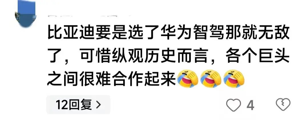 網(wǎng)友三,如果比亞迪能選擇華為智駕那就無敵了,可惜縱觀歷史,巨頭之間很難合作得起來。