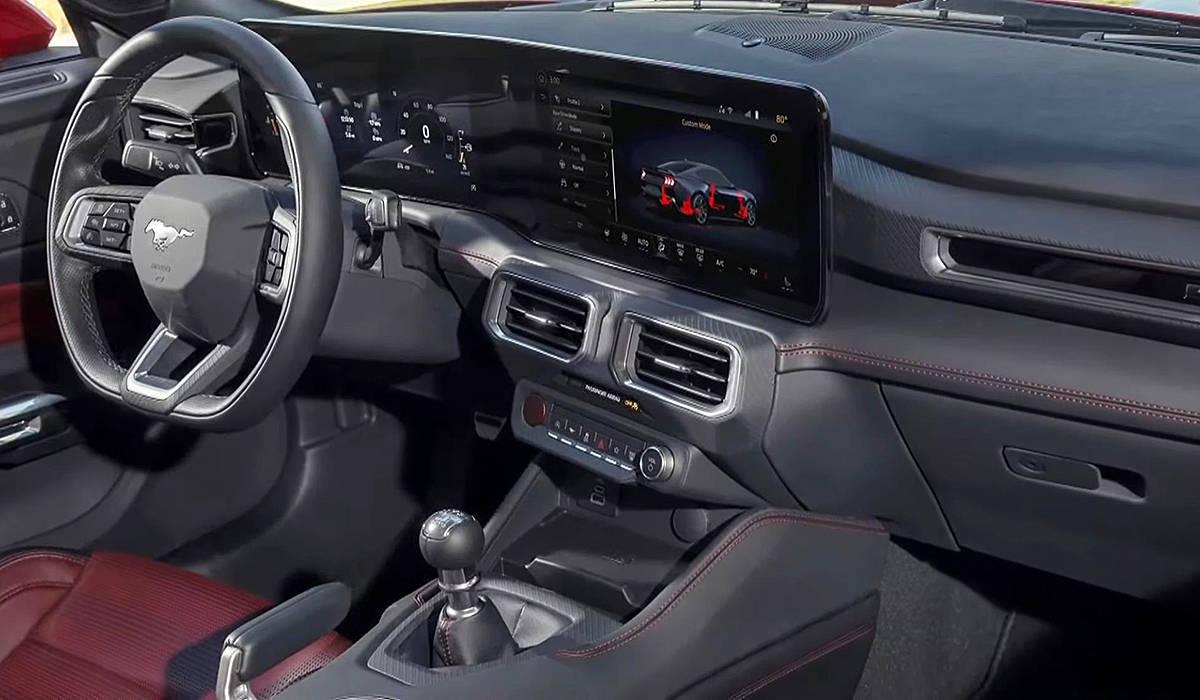 在內飾上,全新一代Mustang換裝了當下流行的貫穿式聯屏,搭配以三輻式多功能方向盤和采用不規則形狀設計的空調出風口,讓新車的內飾在具備鮮明時尚感的同時,更增加了不少的運動氣息。值得一提的是,全新一代Mustang依舊保留了機械式球頭換擋桿和一定數量的實體物理按鍵,讓新車保留了應有的機械質感。
