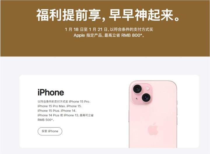 今天(1月15日),蘋果中國(guó)官網(wǎng)公布了迎新春限時(shí)優(yōu)惠活動(dòng)預(yù)告,首頁顯示稱1月18日至1月21日,Apple滿滿福利陪你迎新春。以符合條件的支付方式買 Apple 指定產(chǎn)品,最高立省800元。
