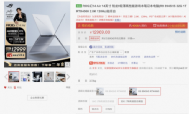 ROG幻 14 Air:AMD R9 8945HS處理器,RTX4060獨顯,32GB內存+1TB SSD,2.8K 120Hz ROG星云屏,73Wh大電池,15.9mm薄+1.5kg輕機身,到手價12969,好評率97%。