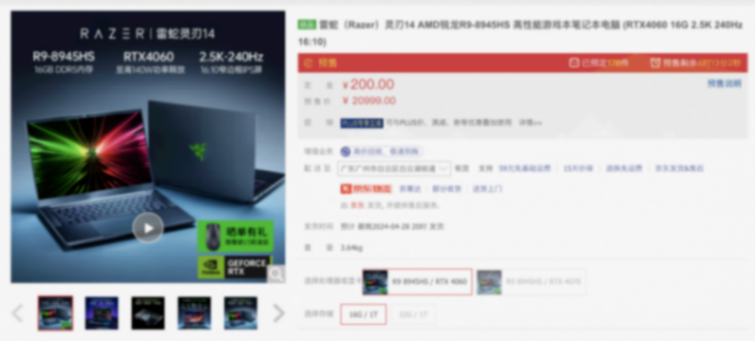 雷蛇靈刃14:AMD R9 8945HS處理器,RTX4060獨顯,16GB內存+1TB SSD,2.5K 240Hz 電競屏,68.1Wh電池,17.99mm+1.84kg機身,到手價20999。