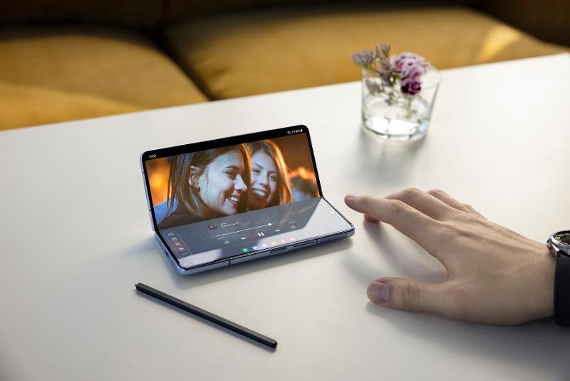 不僅如此,三星Galaxy Z Fold5還擁有更為完善的立式交互模式,讓用戶獲得類似筆記電腦的高能交互體驗。例如,用戶出差途中需要參加視頻會議,可以將三星Galaxy Z Fold5放在高鐵的小桌板上,上半屏幕進行視頻,下班屏幕則可以記錄會議紀要、瀏覽會議資料等。在觀看視頻時,三星Galaxy Z Fold5升級的立式交互觸控功能大幅優化了操作層級,讓高效的沉浸體驗一觸即達。例如,用戶觀看學習資料、設計演示視頻等內容時,可以在下半屏通過觸控來實現暫停/播放、快進/快退、音量增大/減小等操作,在提升效率的同時,還能讓用戶更加專注。