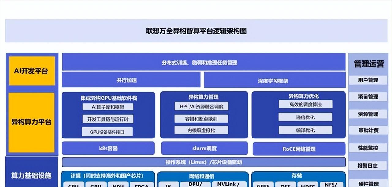 所謂一橫,是指異構(gòu)智算平臺(tái)。這款平臺(tái)融合了聯(lián)想多年來在通用計(jì)算、科學(xué)計(jì)算、AI計(jì)算領(lǐng)域的技術(shù)積淀,可統(tǒng)一調(diào)度和管理CPU、GPU、DPU等異構(gòu)算力。通過智能算法,異構(gòu)智算平臺(tái)能精準(zhǔn)匹配場(chǎng)景需求與算力資源,最大化算力利用率。