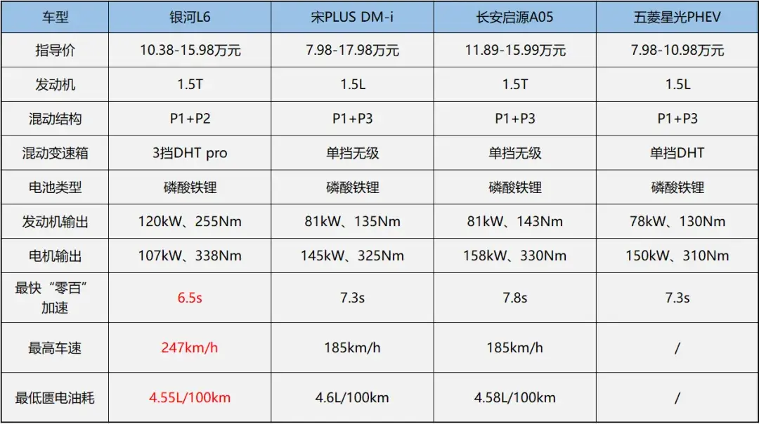 將銀河L7和L6與同級別的單擋插混車型進行對比不難發現,這兩款車的發動機輸出是最強的,零百加速是最快的,而且匱電狀態下的油耗也是最低的,這說明雷神混動8848的有著更高的系統效率,動力和能效都超越單擋插混系統。