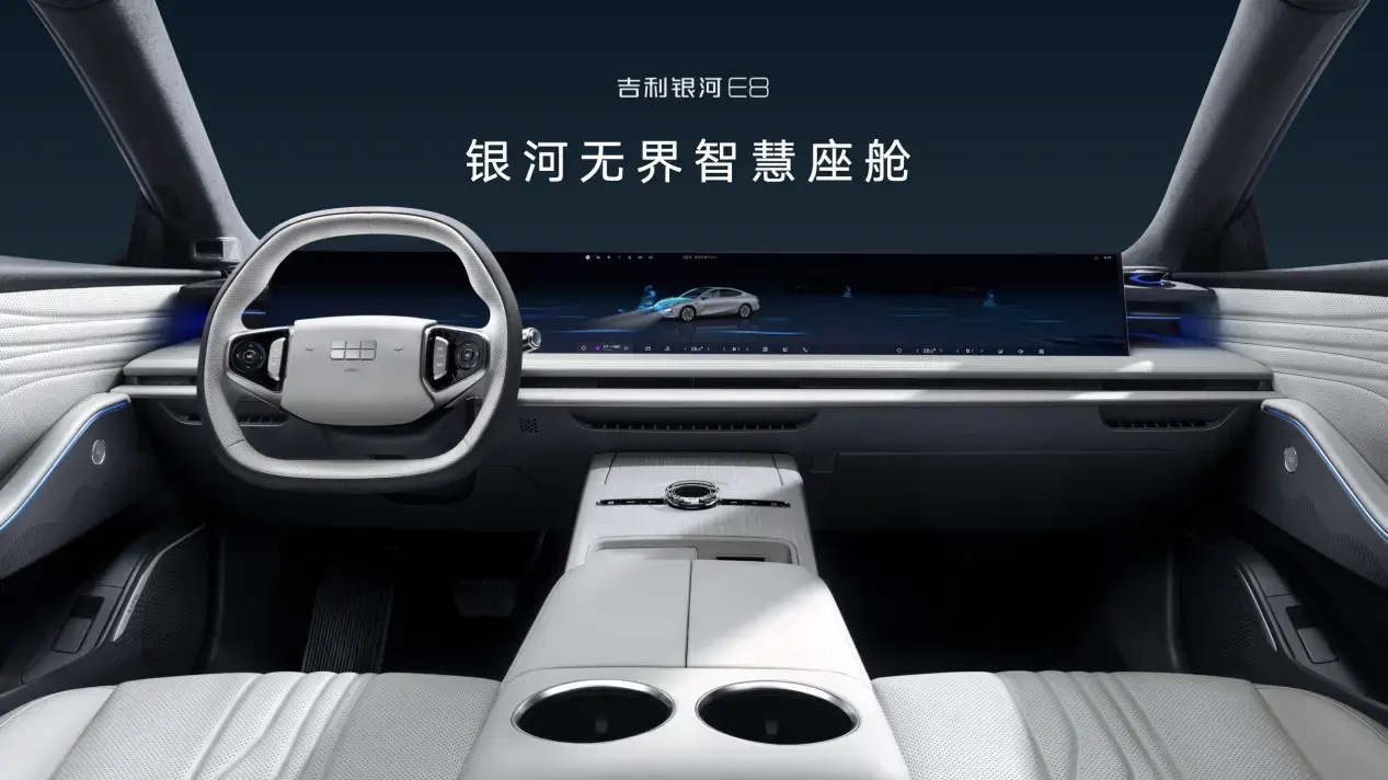 硬件C級了,設計部分,銀河E8同樣沒有落下,外觀應用了“漣漪美學”設計理念,擁有燈幕前臉、轎跑姿態、燈語貫穿尾燈。內飾則是搭載長度高達 1.157米的45 英寸大連屏,內在配備驍龍 8295 芯片、銀河N OS—無界版車機、Flyme Link手車互聯系統。