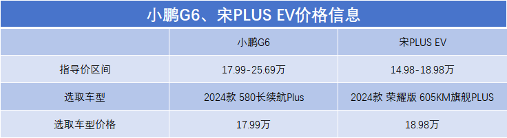 對比的大前提是價格統一,咱們也分別選取小鵬G6和宋PLUS EV終端價格接近的車型進行對比,即小鵬G6 2024款 580長續航Plus 、宋PLUS EV 2024款 榮耀版 605KM旗艦PLUS(下文分別簡稱:小鵬G6、宋PLUS EV),前者的終端價格為17.99萬,后者為18.98萬,下面咱們以這兩款車型為例,進行對比。(注:小鵬G6配圖為2023款 700四驅高性能Max)