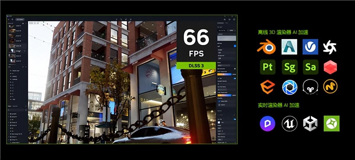 來到3D設計,RTX 40 系列GPU可以為各種離線渲染器、實時渲染器提供AI加速,最近流行的D5,大名鼎鼎的UE、Unity都可以從中獲益匪淺,其中更是可以用到DLSS。