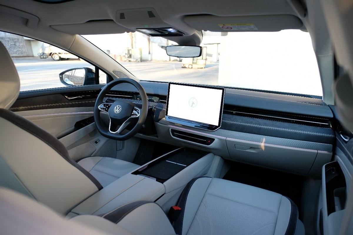 第一眼見到ID.7 VIZZION的內飾,它會營造出一種極其簡約、干凈的印象,中控區域沒有任何實體操作按鍵,全部集成在了中間那塊大屏幕上。內飾的整體做工精致、細膩,日常接觸的區域全部用上了軟質材料進行覆蓋,門板和副駕駛臺區域還用上了翻毛皮材質進行點綴,營造一絲運動氛圍。