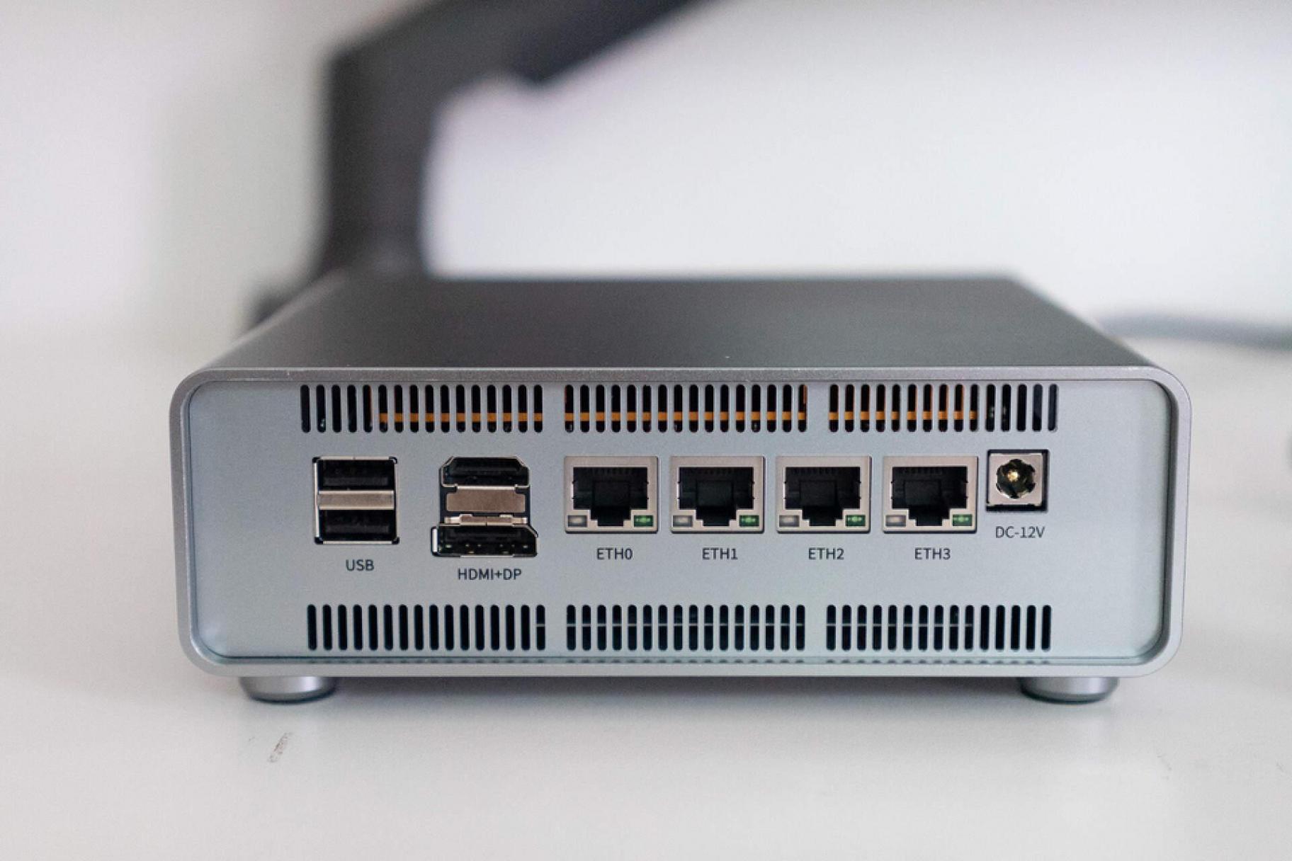 背面有兩個USB 2.0接口、HDMI+DP雙接口,并且提供了4個2.5G的英特爾i226網口,最右是DC電源口。內部有主動散熱風扇,并且還能看到主板上巨大的全銅被動散熱片。