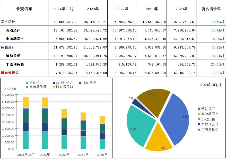 2024年1季度,長安汽車總資產達到19,054,927.92萬元,去年19,017,112.71萬元,與期初持平;其中流動資產達到13,100,502.32萬元,與期初持平,非流動資產達到5,954,425.59萬元,比期初提升0.52%。