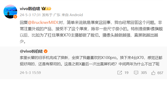 那么為何vivo近兩年多的時間一直堅持用曲屏呢?現在藍廠的產品經理給出了答案。他講vivo X70系列是藍廠X系列的最后一代直屏,中間兩年為何不出了呢?答案其實很簡單,就是因為厚度。非常注重外觀的產品接受不了這個厚度,除非一些尺寸很小的。特別是做影像旗艦之后,攝像頭越做越強,直屏就越出越少。甚至是vivo X70為了輕薄,主攝都做了裁切。