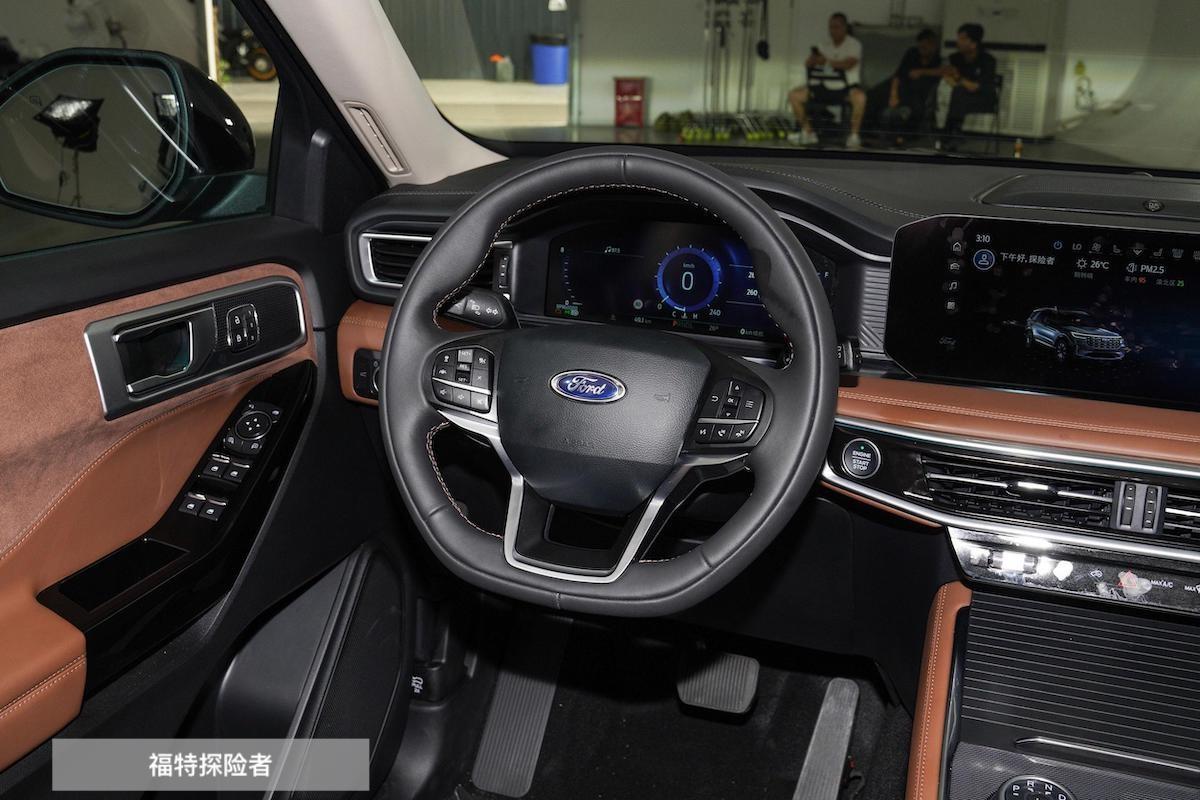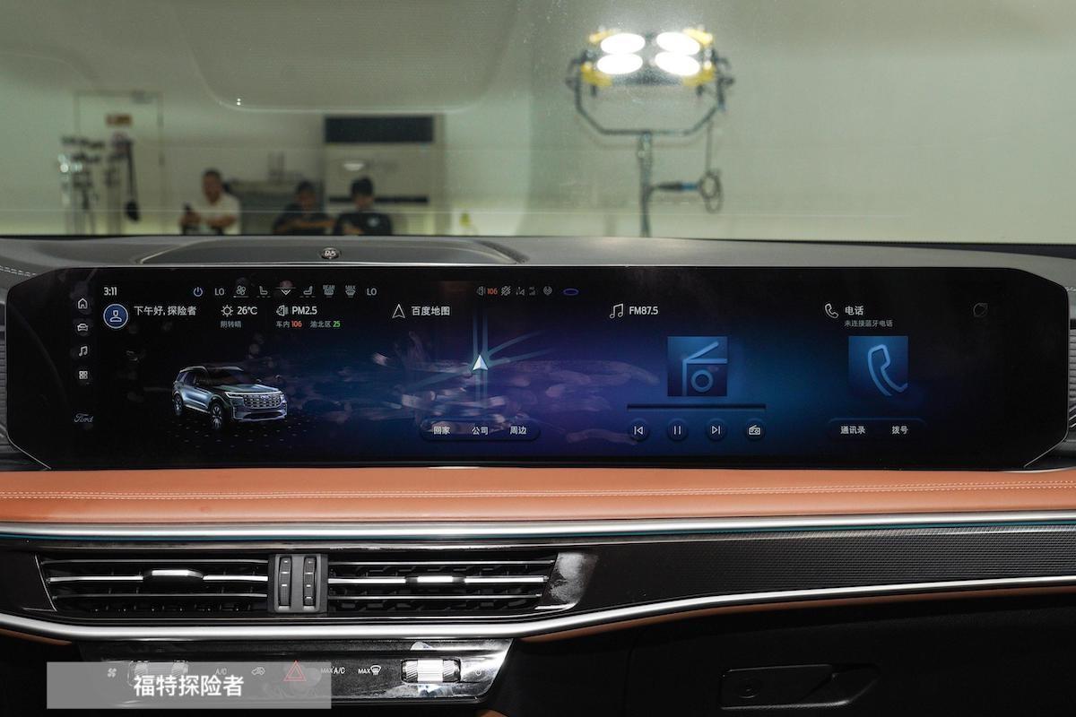 探險者在艙內也會給人一種豪華硬派的味道,我們在這里見到了大面積的棕色帶絎縫軟包,從中控到門板、從座椅到扶手都包裹得嚴嚴實實。但在中控上,我們還見到了更具科技感的12.3英寸數字儀表+27.0英寸一體式液晶屏,后者覆蓋了中控與副駕駛位置,配合電子旋鈕換擋器,還有帶精致滾輪的空調控制臺,反倒是讓人覺得探險者會是更高檔的那一個。